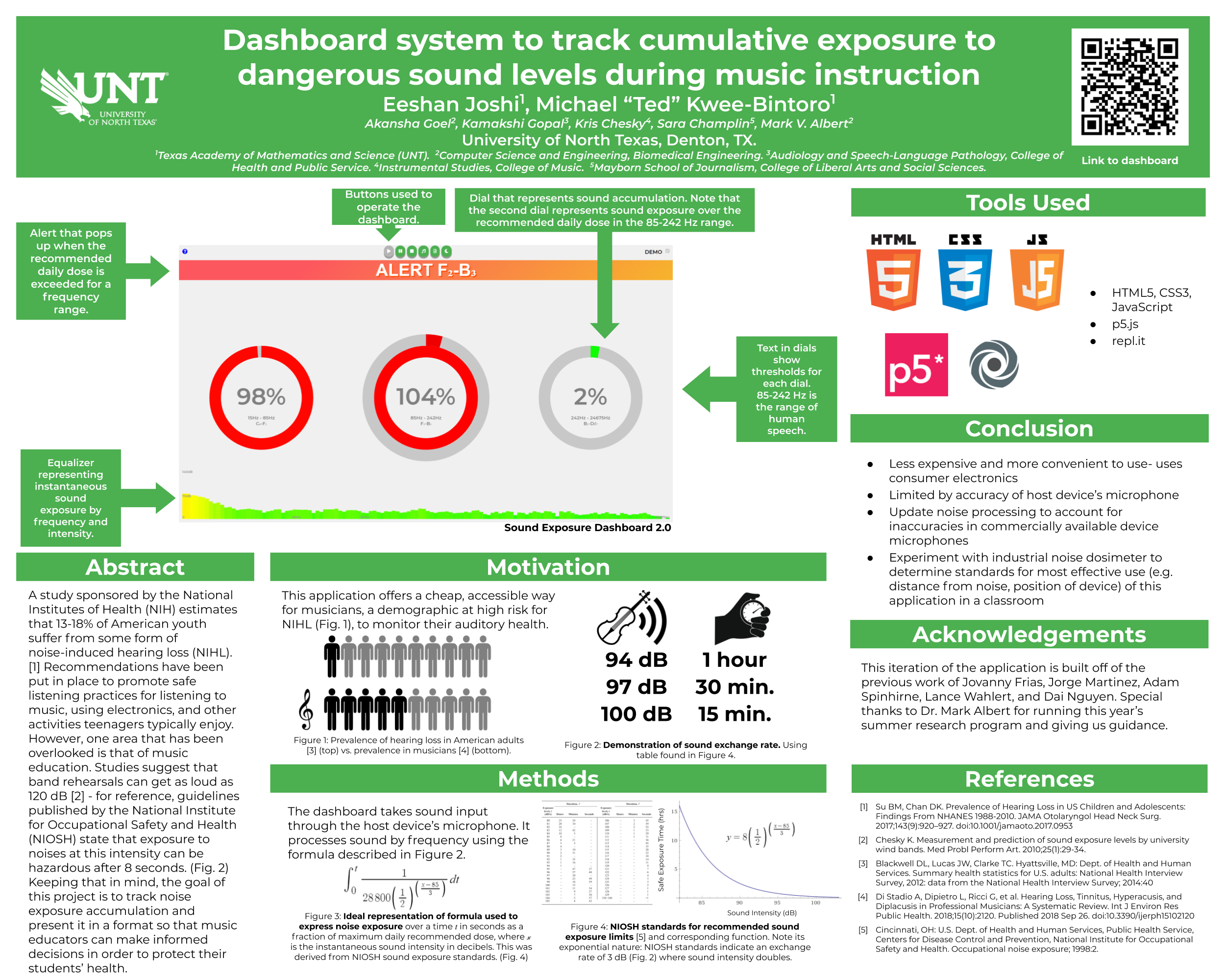 I undertook this project at the Biomedical Artificial Intelligence Lab at the University of North Texas under Dr. Mark V. Albert. The purpose of this application is to provide musicians with a means of protecting their hearing health by tracking their sound exposure over the course of a rehearsal. The dashboard is available here, the preprint is available here, and the research poster we made is available here.